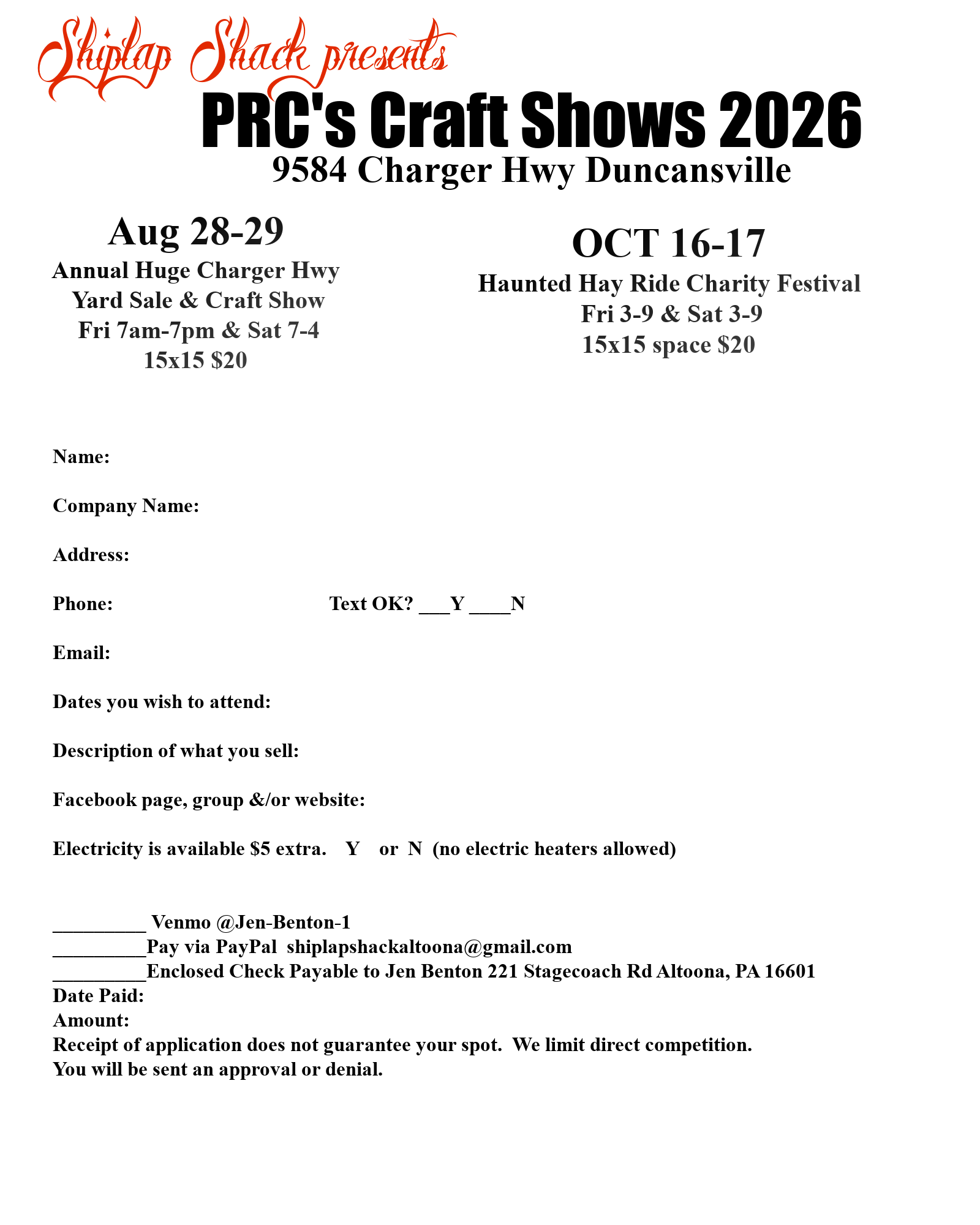 The Craft Shows are held at 9584 Charger Hwy Duncansville. In the field behind main house. Look for our 12 foot skeleton in the driveway. 2025 schedule is below. We are combining the first craft show in June with a huge annual yard sale. September is the fall show kick off! Then season closer is the Haunted Hayride Craft show festival. All Local businesses, crafters, direct sale vendors and artist are welcome.